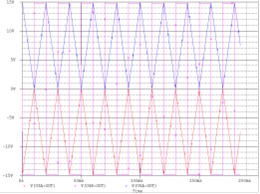 Далее приведены графики, поэтапно показывающие, как формируется развёртывающее напряжение коллектора для исследуемого транзистора Q3. Операционный усилитель U4B формирует прямоугольный сигнал из синусоидального напряжения за счёт большого коэффициента усиления. ОУ U3A является интегрирующим и из прямоугольного сигнала формирует пилообразный сигнал. ОУ U5A является инвертирующим и формирует напряжение коллектора исследуемого транзистора Q3.