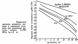 Зависимость затухания медианного значения мощности относительно свободного пространства от расстояния, измеренная Окамурой, приведена на рис. 1.7.