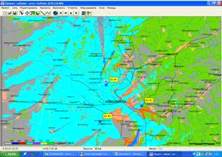 На рис 3.14 очерчен круг радиусом 5 км, внутри этого круга различным цветом указаны уровни сигнала (самый сильный уровень зеленый, далее желтый, розовый, голубой, красный, синий и серый, который указывает на отсутствие сигнала).
